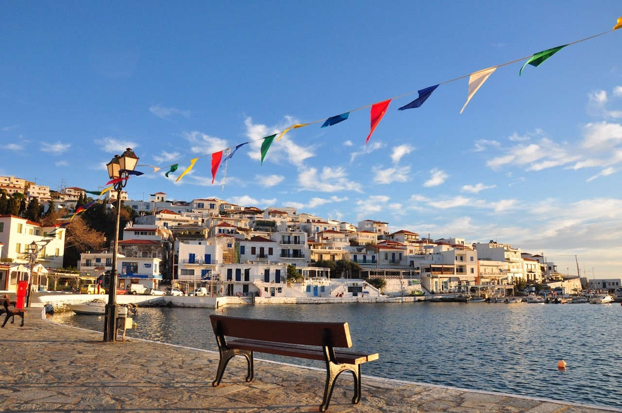 The white-washed seaside village of Batsi, which stretches along a crescent-shaped beach on the western coast of Andros, is one of the Grecian island’s most lively towns. Or so we’ve been told by the locals when we arrive after a two-hour ferry from Athens. But when we’re dropped off by the local bus, the streets stand silent, the restaurants are open but empty and only the sun basks on the beach. Though it’s early November and low season, we don’t expect it to be this quiet. As we walk along the narrow promenade, the only visible sign of life comes from the flapping Grecian flags that are tied between lamp posts and the yachts that rock and roll over the gentle swells in the harbour.