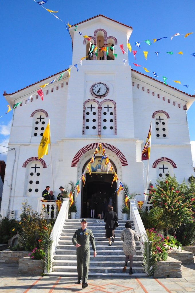 We walk towards the church’s ringing bells. And here we find the residents spilling out into the sunlight. As they step out, they are each handed a small loaf of bread that was blessed with holy water during mass. It’s the festival of Saint Philippos and we’re warmly invited to join the celebrations. The marching band leads the procession down the steps to the beachfront and through the town, with an adorned painting of the saint shrouded with flowers at the head, followed by Greek Orthodox priests, churchgoers and school children in their Sunday best walking in time with the beat.