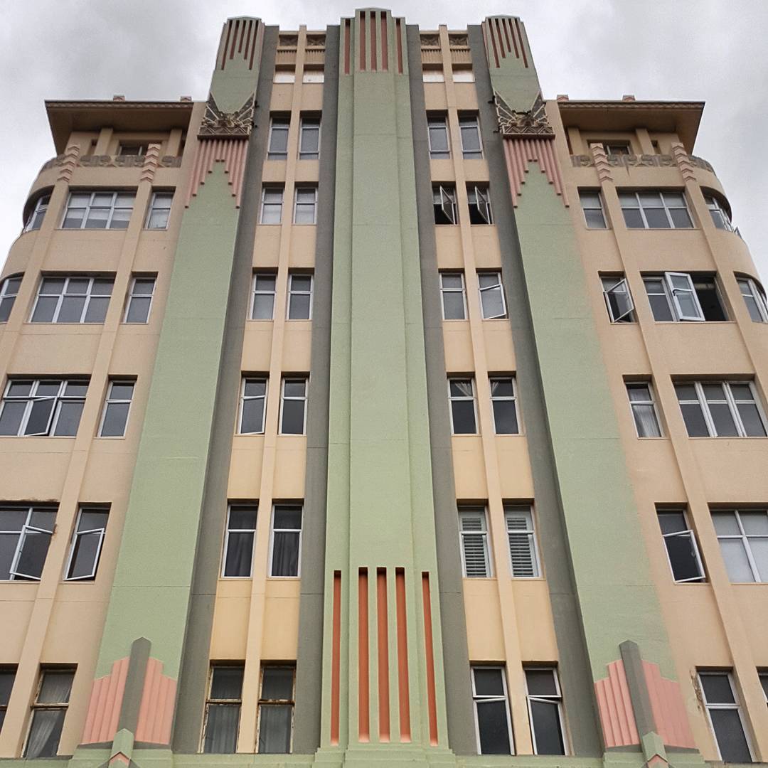 Designed in 1931 by A A Ritchie McKinley, this classic Art Deco building has beautifully detailed geometric animal and abstract figures. It was then, and still is, an eight-storey apartment building in the heart of the city.