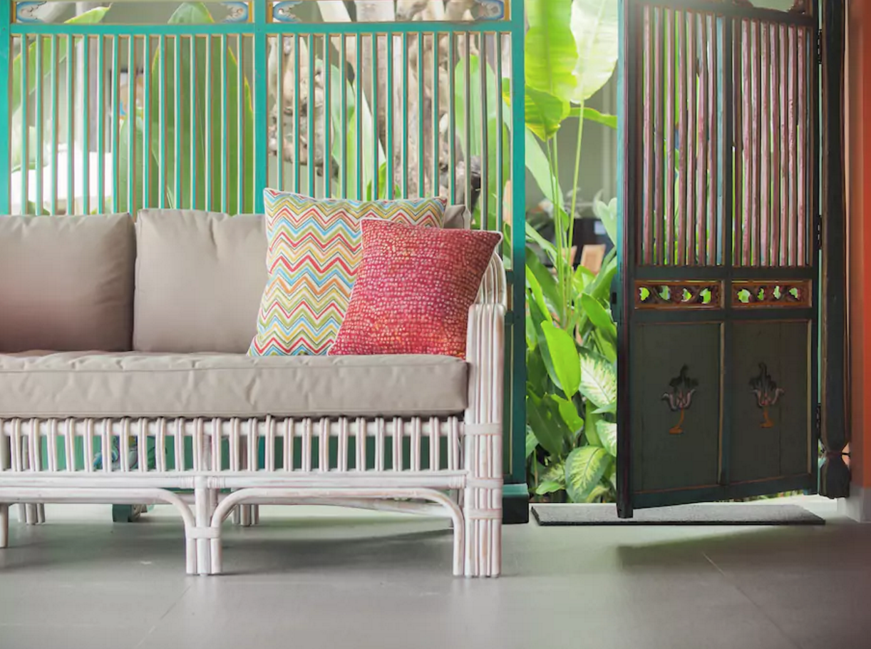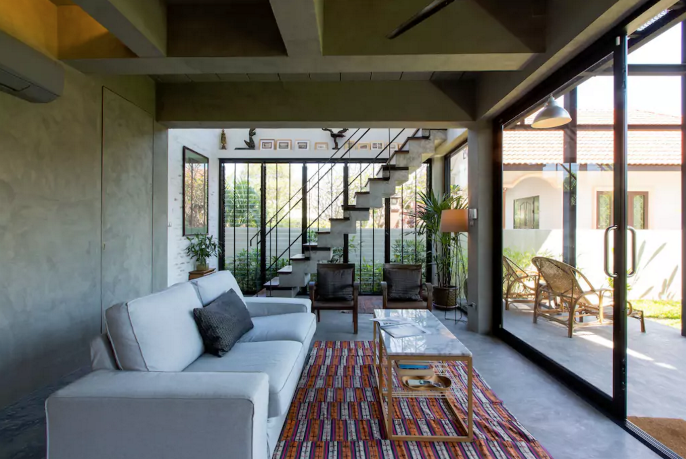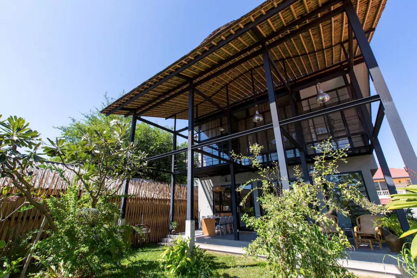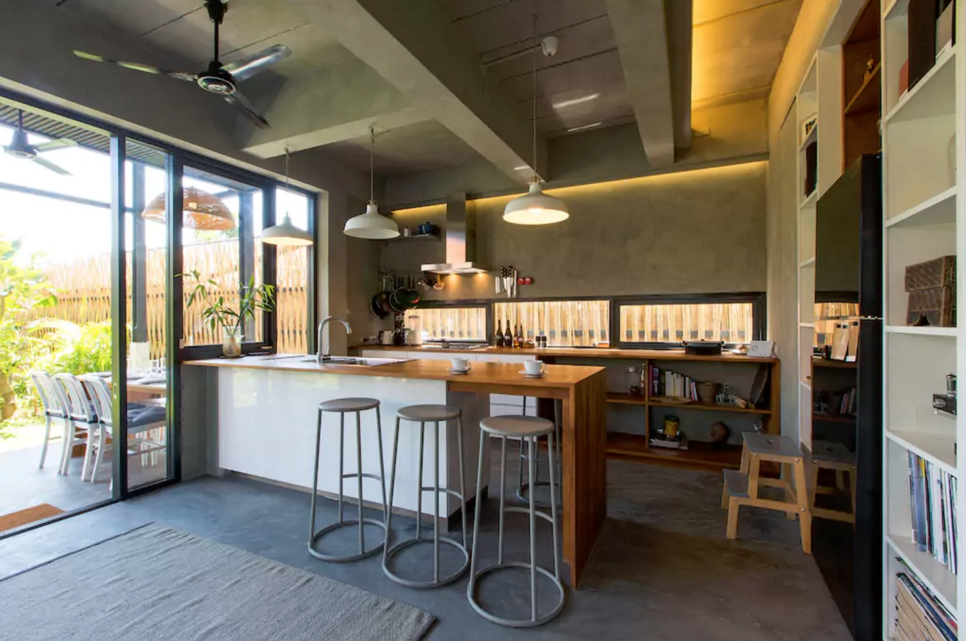 This villa in Hua Hin, Thailand has a terrace which overlooks the lush garden. Designed by a local architect it’s just 3 minutes from the sea, restaurants and grocery store. The owner also includes his bike in the rental.