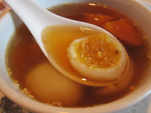 This dish is rather fantastic for breakfast or dessert. This is glutinous rice balls filled with sweet black sesame or sometimes even red bean paste, then finished with chopped nuts. It might not look jaw-dropping, but it is really delicious!