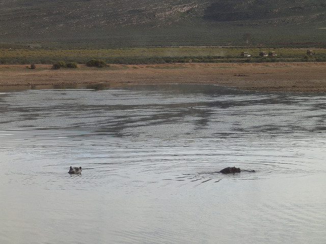Hippos peep out the water at Aquila Game Reserve. Hippos are one of the most dangerous animals in Africa and kill more humans than any other animal.