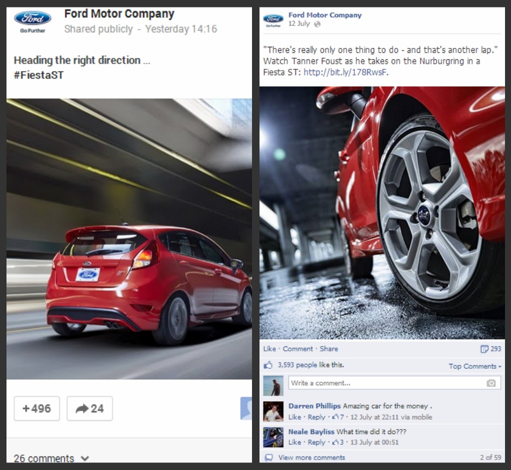Ford’s latest post about the Fiesta ST on G+ got 496 +1’s, 24 shares and 26 comments, 546 total engagements; it’s a rather typical post from the motoring giant. Their post about the Fiesta ST on Facebook, with it’s smaller fan-base, with an arguably less engaging image got 3593 likes, 293 shares and 59 comments, 3945 total engagements. That’s 0.02% of total followers engaged on G+ and 0.20% of total followers on Facebook, the latter saw a 10 times higher engagement rate.