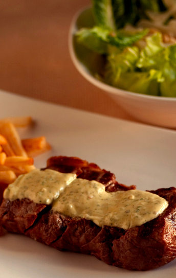 The salad is cos lettuce, a generous handful of toasted pine nuts, shavings of fresh parmesan and a light and lovely mustard vinaigrette. The sirloin is free range from Namibia or Botswana, perfectly cooked and served with Café de Paris butter. The chips are skinny and double-fried: crisp on the outside, soft on the inside. In essence, it may only be one meal, but it is one perfect meal.