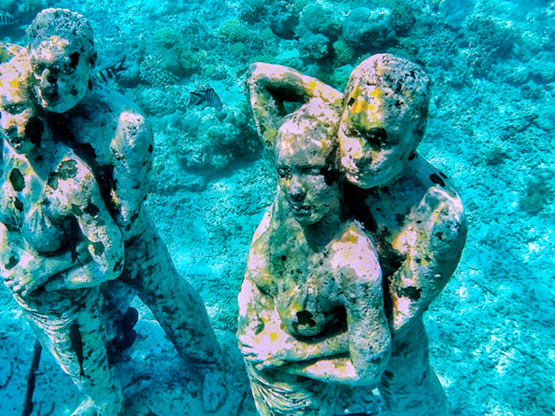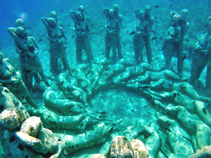 The sculptures are made from pH neutral, environmental grade concrete and based on the casts of real people. The idea behind these is to aid the growth of the dying coral reefs, by providing a natural home for new corals to form, thus transforming the sculptures into a reef.