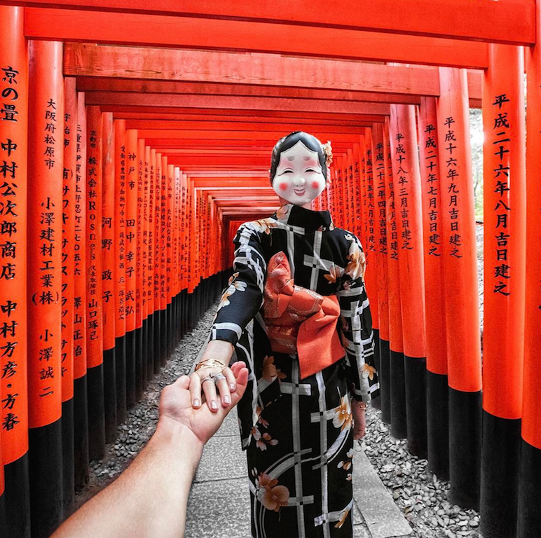 Follow famous insta couple Murad Osmann and Natalia Zakharova as they traverse the world. Kyoto Fushimi Inari shrine can be found at the foot of a mountain. There are many trails and temples to visit here so take your time.
