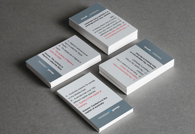 Simply choose a player who will read the cards to the group. The card will feature three statements about a destination, of which, the one in red text is a lie. A point is awarded to the player who guesses the lie correctly. At the end of the game, the player with the most points wins.