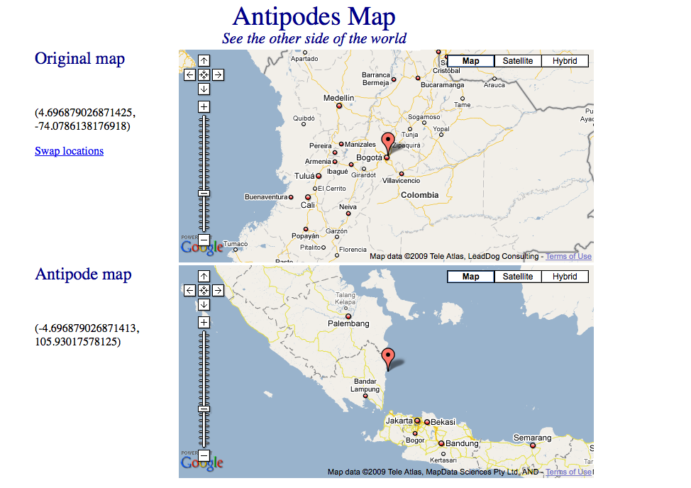 Thanks to the folks at Google Maps you can now easily get to know your antipode online. Follow the link for a user friendly antipode map.