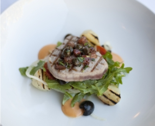 Grilled tuna Nicoise with confit potatoes and sauce vierge