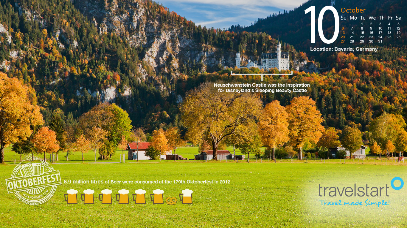 Maybe you’re not in Munich for the 2013 Oktoberfest festivities but in the spirit of all things pretzel, dirndl, Oom-pah and Weiss, October’s free desktop wallpaper calendar takes you to Germany – more specifically Bavaria and the birthplace of the much anticipated annual beer fest.