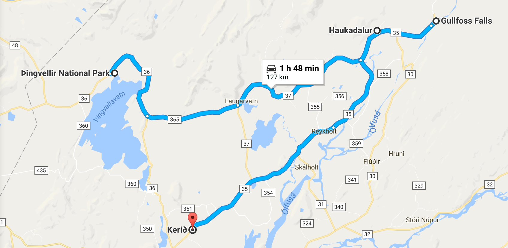 The famous Golden Circle is a popular tourism route in south-west Iceland which encompasses the Þingvellir National Park, the Gullfoss waterfall, the geothermal area in Haukadalur and the Kerid Crater Lake.