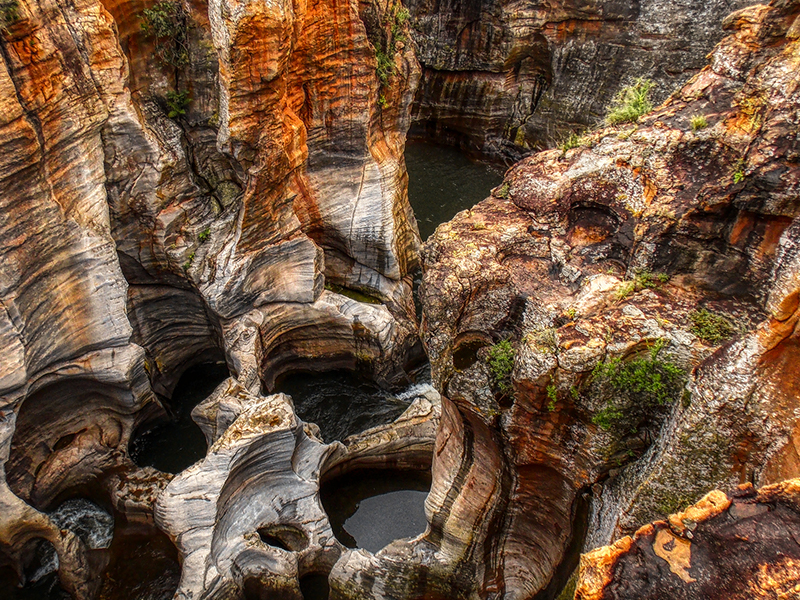 A Blyde River visit is not complete without a visit to the Bourke’s Luck Potholes. This geological marvel is a result of the meeting of the Blyde River (river of joy) and the Treur River (river of sorrow). Thousands of years of water erosion has caused cylindrical rock formations to be carved by swirling water. Walk among multicolored swirls of naturally sculpted beauty and collect some memorable snaps while you’re at it.